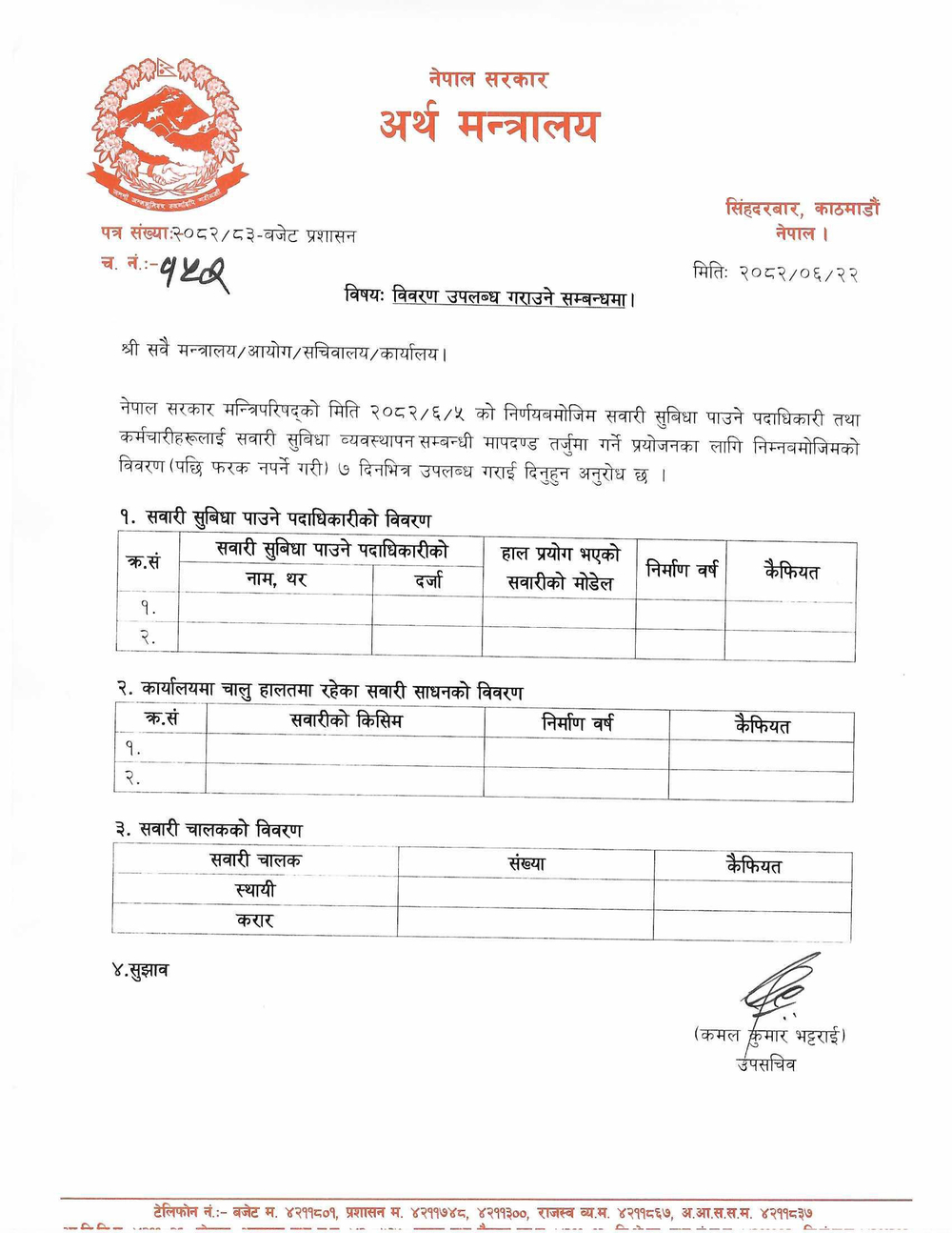 मन्त्रालयले यसै सन्दर्भमा सबै मन्त्रालय, आयोग, सचिवालय तथा कार्यालयहरूलाई पत्र पठाएर सात दिनभित्र आवश्यक विवरण बुझाउन आदेश दिएको छ। पत्रअनुसार पठाइने विवरणमा कर्मचारी वा पदाधिकारीको नाम, पद/दर्जा, सवारीको मोडेल, निर्माण वर्ष, चालकको अवस्था (स्थायी/अस्थायी) सहित सम्पूर्ण जानकारी समावेश हुनुपर्नेछ।