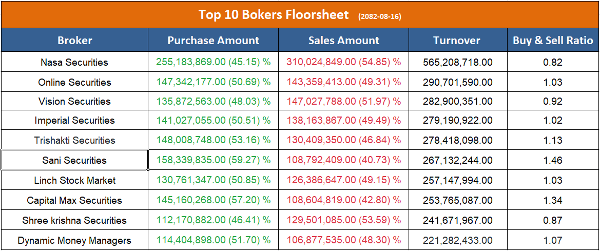 उच्च खरिद गर्ने ब्रोकरहरुमा अनलाइन सेक्युरिटिज, इम्पेरियल सेक्युरिटिज, त्रिशक्ति सेक्युरिटिज, सनि सेक्युरिटिज, लिन्च स्टक मार्केट, क्यापिटल म्याक्स सेक्युरिटिज र डायनामिक मनि म्यानेजर्स रहेका छन् ।