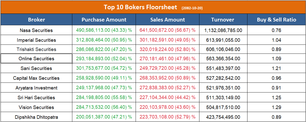 उच्च खरिद गर्ने ब्रोकरहरुमा इम्पेरियल सेक्युरिटिज, अनलाइन सेक्युरिटिज, सनि सेक्युरिटिज, श्रीहरि सेक्युरिटिज र भिजन सेक्युरिटिज रहेका छन् ।