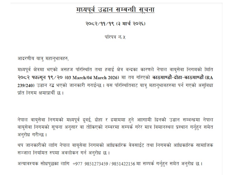 उडान रद्दबाट यात्रुहरूमा पर्न गएको असुविधाप्रति निगमले क्षमायाचना गर्दै दुबई, दोहा र दमाम गन्तव्यका आगामी उडानबारे विमानस्थल आउनुअघि नै अद्यावधिक जानकारी लिन आग्रह गरेको छ।