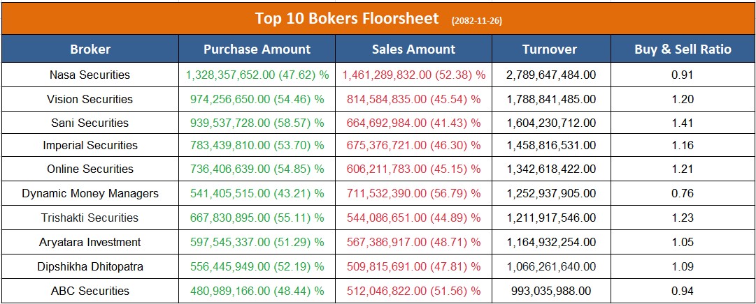 त्यस्तै, उच्च बिक्री गर्ने ब्रोकरहरुमा नासा सेक्युरिटिज, डायनामिक मनि म्यानेजर्स र एबीसी सेक्युरिटिज रहेका छन् ।