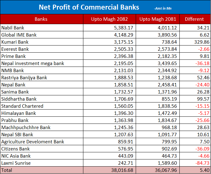 यो नाफा गत आवको सोही अवधिसम्मको तुलनामा ५.४० प्रतिशत बढी हो । गत आवको सोही अवधिसम्म वाणिज्य बैंकहरुले ३६ अर्ब ६ करोड ७९ लाख रुपैयाँ नाफा कमाएका थिए ।