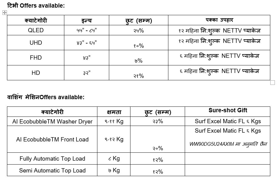 यस क्याम्पेन अन्तर्गत सामसङले टिभी मा २५% सम्मका छुट वाशिंग मेशिनमा २३% सम्मका छुट, र रेफ्रिजरेटरमा १७% सम्मका छुट उपलब्ध गराएको छ। नयाँ वर्षको सुरुवातमै घरका आवश्यक उपकरणहरू अपग्रेड गर्न चाहने परिवारका लागि यो निकै उपयोगी अफर रहेको कम्पनीले जनाएको छ ।