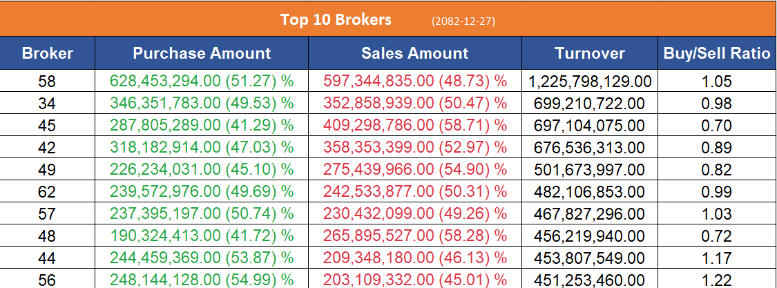 उच्च खरिद गर्ने ब्रोकरहरुमा नासा सेक्युरिटिज, आर्यतारा इन्भेष्टमेन्ट एण्ड सेक्युरिटिज, डायनामिक मनि म्यानेजर्स र श्रीहरि सेक्युरिटिज रहेका छन् ।