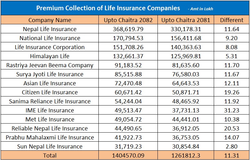 त्यस्तै, नेशनल लाइफले १७ अर्ब ७ करोड, एलआइसी नेपालले १५ अर्ब १७ करोड, हिमालयन लाइफले १३ अर्ब २६ करोड, राष्ट्रिय जीवन बीमा कम्पनीले ९ अर्ब ११ करोड, सूर्यज्योति लाइफले ८ अर्ब ५५ करोड, एशियन लाइफले ७ अर्ब २४ करोड, सिटिजन लाइफले ६ अर्ब ६ करोड, सानिमा रिलायन्स लाइफले ५ र्ब ४२ करोड, आइएमई लाइफले ४ अर्ब ९्र५ करोड, मेट लाइफले ४ अर्ब ९० करोड, रिलायबल नेपाल लाइफले ४ अर्ब ४४ करोड, प्रभु महालक्ष्मी लाइफले ४ अर्ब १९ करोड र सन नेपाल लाइफले ३ अर्ब १७ करोड रुपैयाँ बराबरको प्रिमियम संकलन गरेका छन् ।